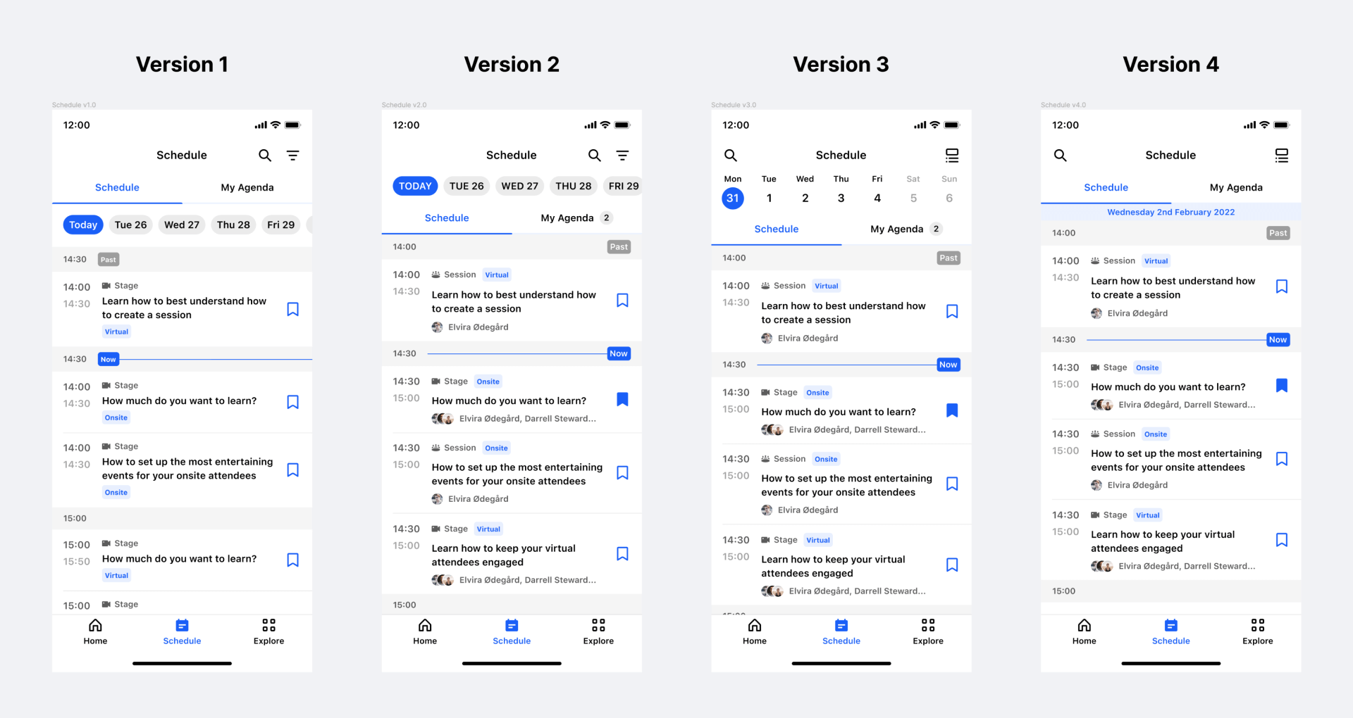 As we moved to higher fidelity designs we got a clearer picture of what we needed to validate first in terms of the structure – for example, should we lead with the date first or the tabs? What happens when the event is just one day vs multiple days?