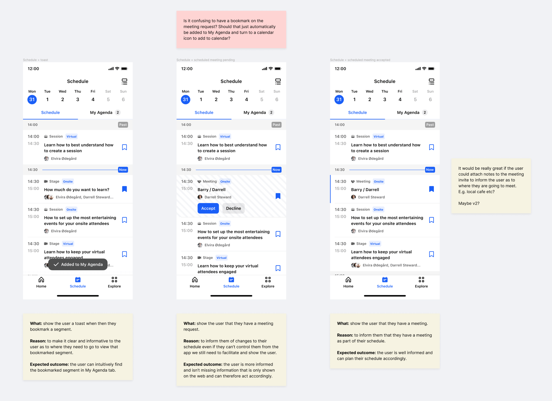 Our designs needed to work even if the user is offline. We couldn’t always rely on a consistent WiFi connection in large conference halls or at events with multiple locations.
